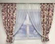 Короткі атласні штори з тюлем з принтом квітів фіолетового кольору на тасьмі